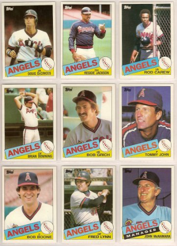 1985 Topps California Angels Team Set includes all 28 cards issued by Topps as part of the regular set. The set features the following players.#42 Luis Sanchez, #61 Curt Kaufman, #86 Don Aase, #111 Doug DeCines, #153 Frank LaCorte, #179 Tommy John, #200 Reggie Jackson, #220 Fred Lynn, #226 Juan Beniquez, #234 Jerry Narron, #258 Mike Brown, #300 Rod Carew, #309 Mike Witt, #348 Bob Boone, #374 Brian Downing, #442 Ken Forsch, #465 Bobby Grich, #497 Gary Pettis(R), #524 Rob Wilfong, #544 Bruce Kison, #579 Ron Romanick, #604 Daryl Sconiers, #629 Dick Schofield(R), #657 Jim Slaton, #682 Doug Corbett, #732 John McNamara,#756 Rob Picciolo, #771 Geoff Zahn...........
