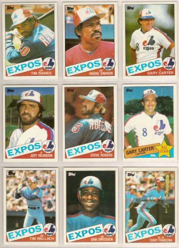 1985 Topps Team Set of the Montreal Expos...Included are all 30 cards produced by Topps in 1985....Players included are Gary Carter, Tim Raines, Andre Dawson, Jim Fanning, Darel Thomas, Bobby Ramos, Doug Flynn, Brian Little, Mike Ramsey, Argenis Salazar, Terry Francona, Gary Carter All-Star, Dan Driessen, Miguel Dilone, Tony Scott, Mike Stenhouse, Tim Wallach, Jim Wohlford, Father & Son Stenhouse Dave & Mike, Father & Son Francona Tito and Terry, Gary Lucas, Bill Gullickson, Fred Breining, Charlie Lea, Bryn Smith, Jeff Reardon, Steve Rogers, Bob James, Dan Schatzeder, and Dave Plamer.