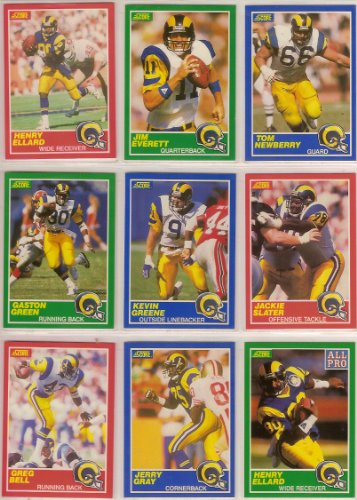 1989 Score Team Set of the Los Angeles Rams....This is the Premier Edition of Score Football....Included are Jim Everett, Tom Newberry, Henry Ellard, Jackie Slater, Kevin Greene, Gaston Green, Henry Ellard All Pro, Jerry Gray, Greg Bell, Ron Brown, Tom Newberry All-Pro, Bill Hawkins (RC), Aaron Cox....Cards are Near- Mint to Mint or Better and Clean....