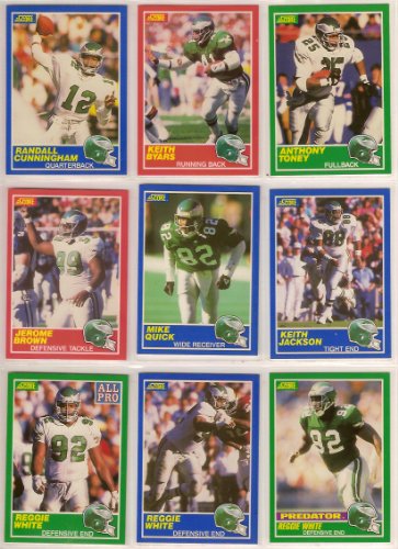 1989 Score Team Lot of the Philadelphia Eagles....Included are Randall Cunningham, Keith Byars, Anthony Toney, Jerome Brown, MikeQuick, Keith Jackson, (3) Reggie White( Regular, All-Pro, and Predator Cards), Keith Jackson All-Pro, Great Combos Cunningham/Jackson, Jessie Small (RC)....Cards are Near-Mint to Mint or Better and Clean....